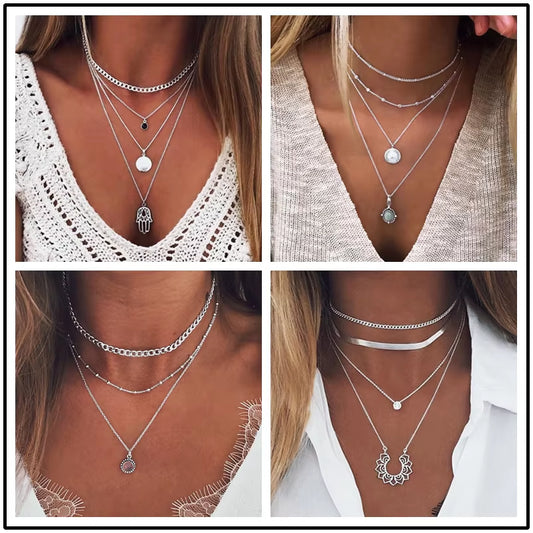 Vintage Multi Layer Party Jewelry Leaves Stars Hamsa Hand Moon Chain Necklaces & Pendants for Women Hot Sale Bijuterias